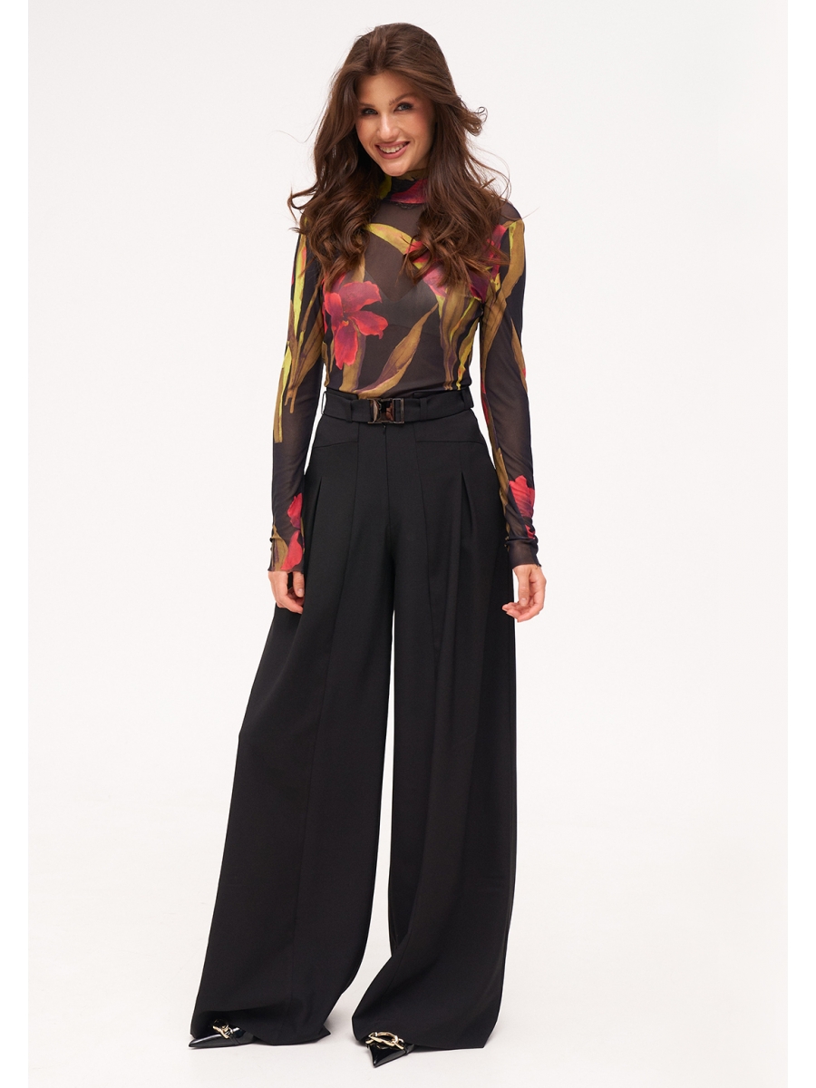 Брюки-палаццо с высокой посадкой по талии. Верх брюк фигурный. По переду вертикальные рельефы по центру и складки. В боковых швах карманы. Застёжка на потайную молнию спереди.
