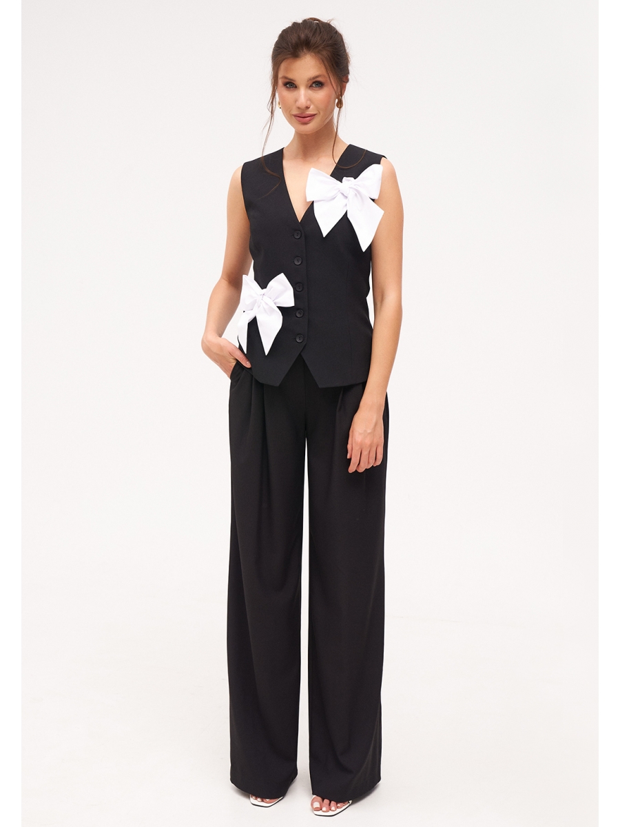 Жилетка женская умеренного объема полуприлегающего силуэта. Перед с талиевыми вытачками и имитацией карманов с листочкой. Спинка с талиевыми вытачками. Жилетка на притачной подкладке. Застежка центральная, на прорезные петли и пуговицы. Длина жилетки до уровня линии бедер. Декорируется съёмными, контрастными бантами.