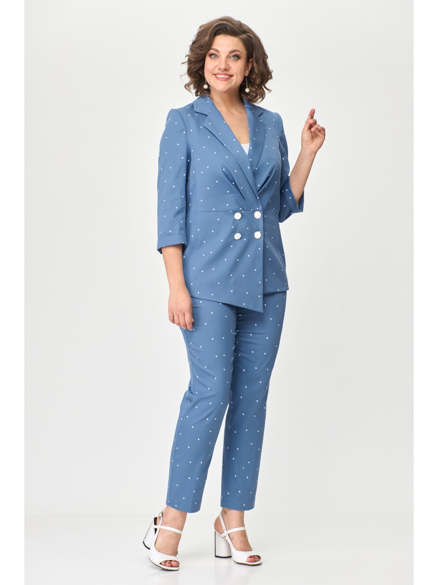 Стильный женский костюм выполнен из хлопковой ткани с принтом «в горошек».