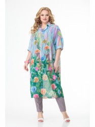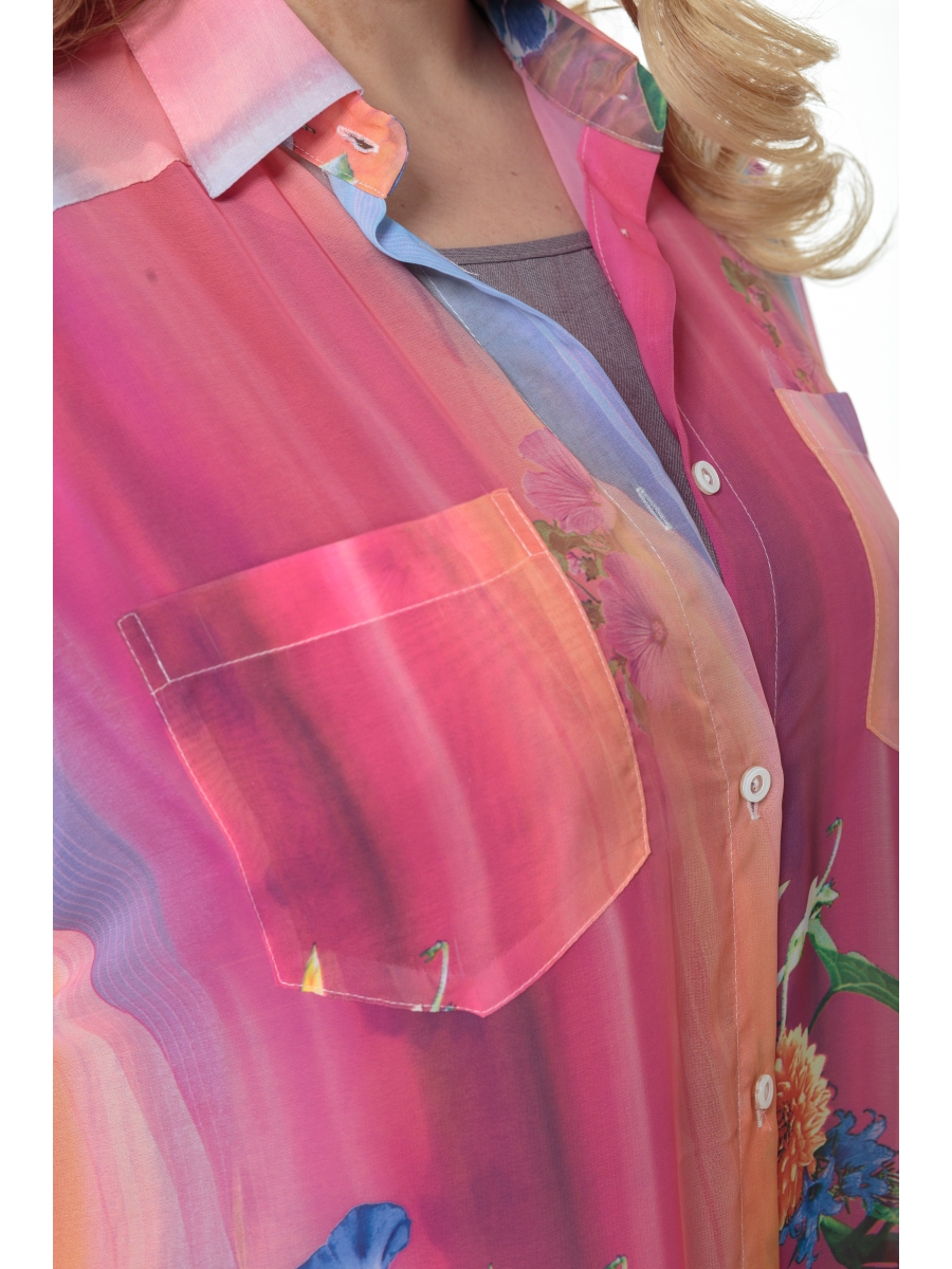 Платье-рубашка свободного покроя со спущенными укорочёнными рукавами на манжете с пуговками. Воротник на притачной стойке. Застежка по всей длине на пуговицы. Выполнен из принтованного шифона различных оттенков!