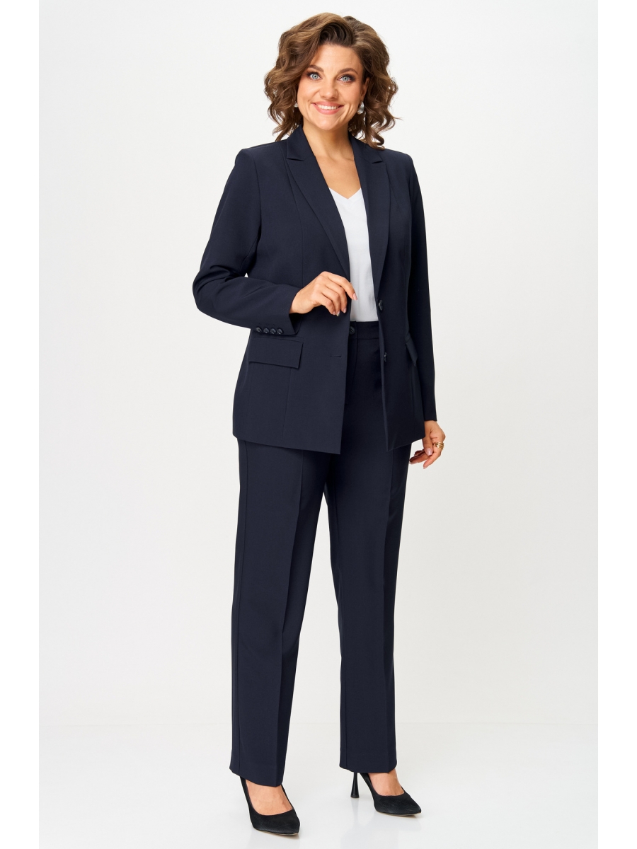 Брюки прямые, классические, с заутюженными стрелками, по переду обработаны карманы с отрезным бочком, застежка на тесьму-молнию и 1 пуговицу. На задних половинках обработаны вытачки и имитация карманов с листочкой, пояс в брюках притачной.