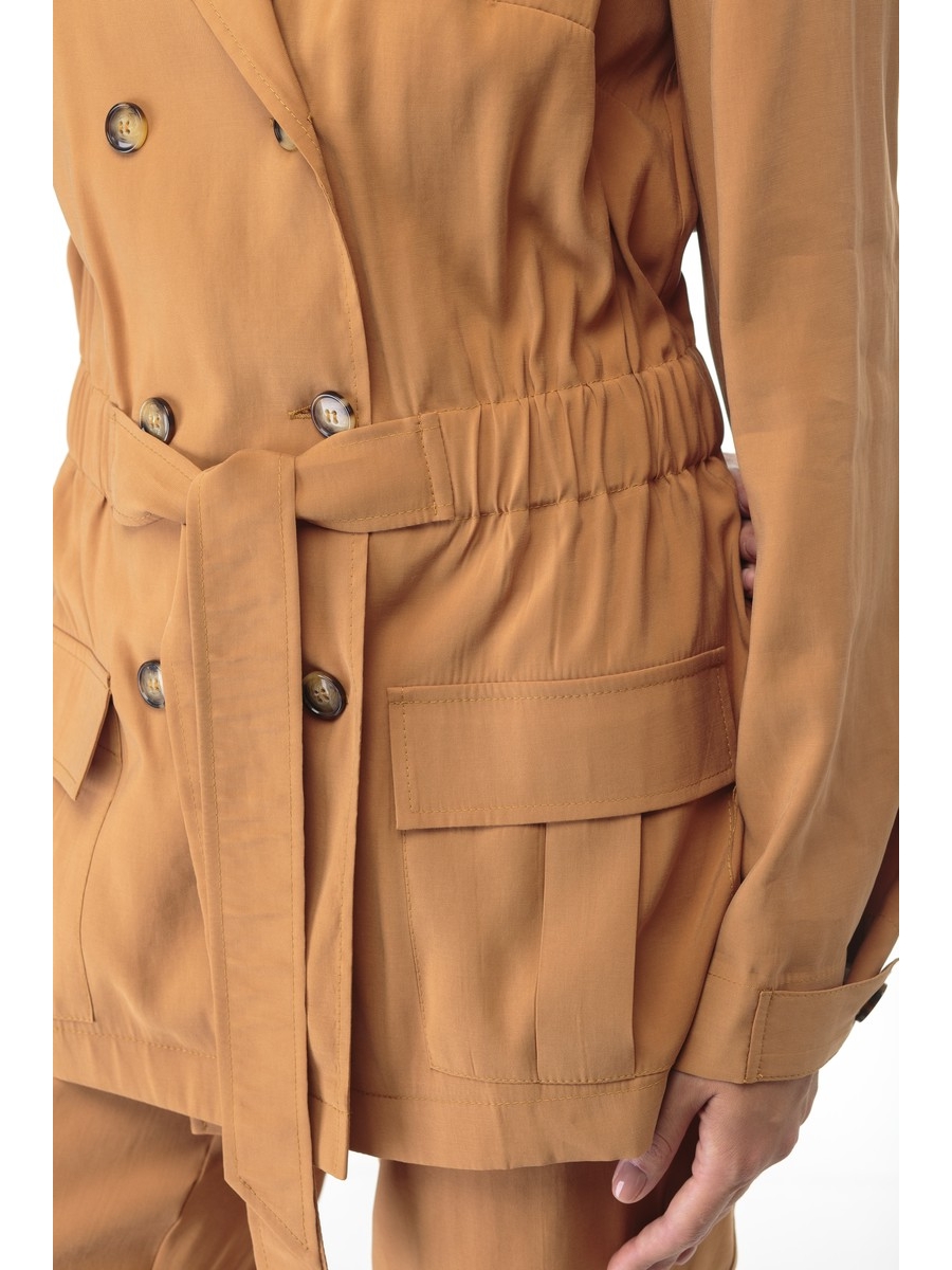 Брючный костюм в стиле сафари - это минималистичный образ с продуманными деталями кроя: двубортный жакет без подкладки свободного, спокойного силуэта с втачными длинными рукавами и патами для регулирования длины. Отложной воротник с бортами, накладные карманы с клапанами, в области талии эластичная лента с завязывающимся поясом.
