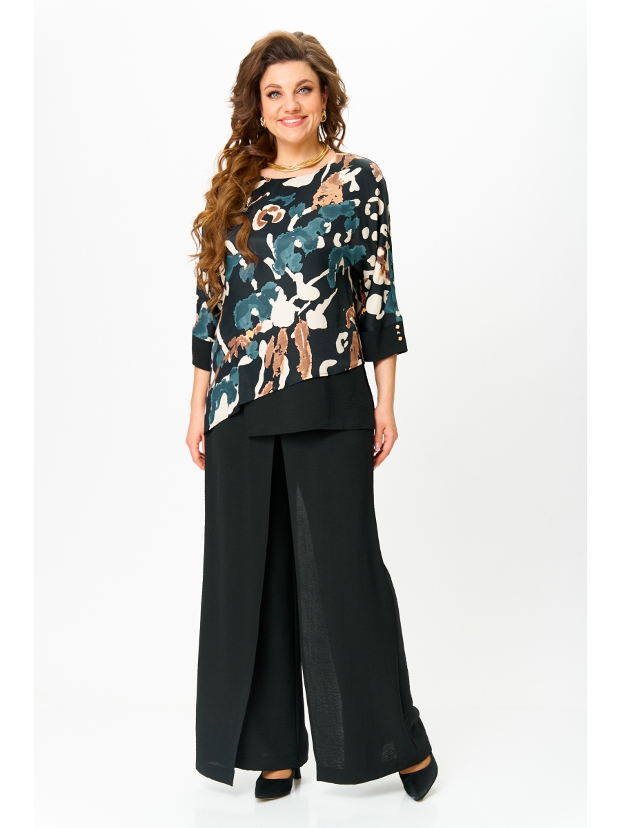 Брюки свободного силуэта, по переду двухслойные, верхняя деталь отлетная, в боковых швах от уровня колена, разрезы. Верх брюк обработан поясом на резинке.