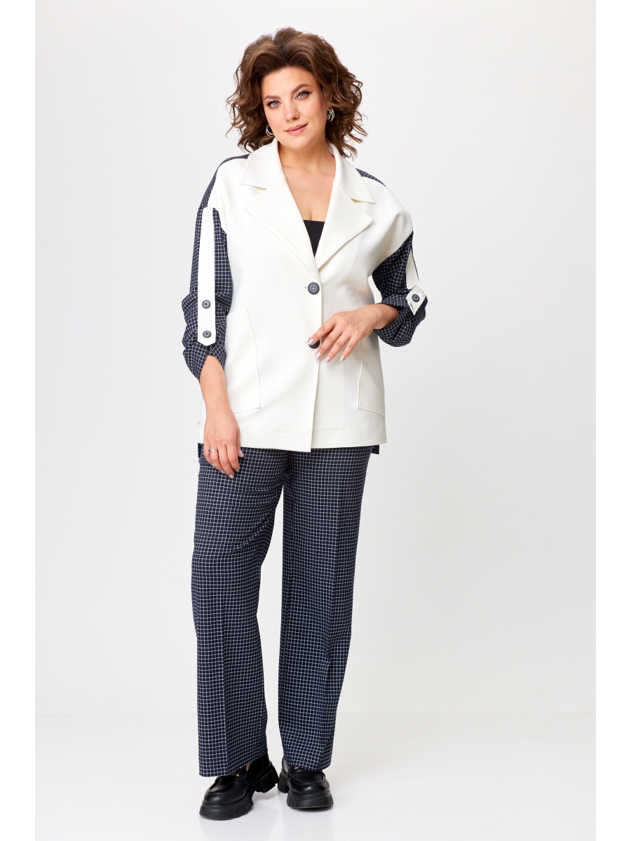 Жакет свободного силуэта со спущенной линией плеча, по переду накладные карманы переходящие на спинку. Воротник пиджачного типа с отложным ламканом. Рукава втачные с декоративной патой на пуговицах. Жакет на подкладке.