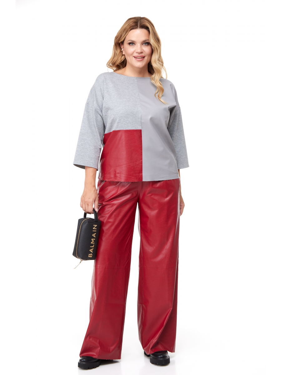 Блузка выполнена из двух видов ткани: трикотажное полотно и ЭКО-кожа. Модель прямого силуэта со спущенным плечом, рукав 3/4 длины. Полочка скомбинирована из квадратов.