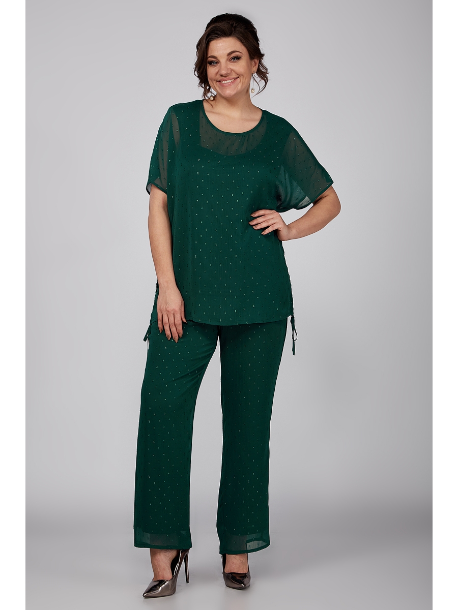 Нарядный костюм больших размеров из струящегося шифона на трикотажной подкладке дополнит гардероб любой женщины, и станет отличным выбором одежды для торжественных и праздничных мероприятий. Благодаря особенностям кроя, костюм скрывает все лишнее и придает женственность силуэту. Брюки с высокой посадкой на резинке визуально стройнят ножки. Блуза со спущенным плечом и разрезом по плечевому шву. В боковых швах блузы обработаны кулисы. Нарядный брючный костюм свободного кроя олицетворяет собой последние тенденции моды, ведь он подходит как для взрослых женщин, так и для очень молодых.