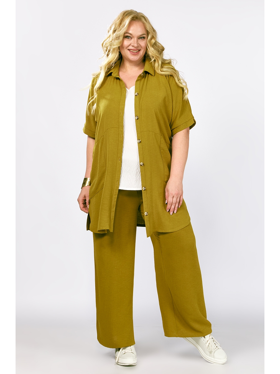 Откройте для себя стильный  женский брючный комплект  из рубашки, блузы и брюк идеально подходящий для различных случаев. Костюмчик брендовый создан для женщин, ценящих комфорт и стиль. Штаны широкого кроя палаццо гармонично сочетаются с классической длинной рубашкой. Брюки частично на резинке с обработанным псевдо гульфиком, с карманами в боковых швах.   Блуза с  разноуровневым низом ,с разрезами  ,со спущенным плечом и декоративной нашивкой. Рубашка с коротким рукавом, застежка планка на пе6тли и пуговицы. Спинка со средним швом. По боковым обработаны разрезы. На полочке настрочены накладные карманы.  Красивый летний наряд прекрасно комбинируется, позволяя создать как повседневный, так и нарядный  образ. Вечеринка или фотосессия — вы будете в центре внимания. Благодаря однотонному дизайну он выглядит аккуратно и стильно, придает уверенности каждой девушке независимо от случая - будь то корпоративное мероприятие или торжество. Легкий молодежный комплект тройка представлен также в больших размерах, чтобы подчеркнуть индивидуальность даме плюс сайз и девушек любителей оверсайз стиля и трендовых необычных образов.