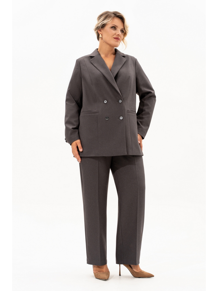 Элегантный женский костюм, в котором классика встречается с современными акцентами. Жакет выполнен в двубортном исполнении с выразительным пиджачным воротником, подчеркивающим строгость и стиль. Рельефы на полочках от плечевого шва придают силуэту структурность, а прорезные карманы в листочку добавляют практичности и утонченности. Особое внимание привлекает спинка: асимметричный рельеф на правой части, переходящий в шлицу, оформленную декоративными пуговицами — неожиданный и эффектный штрих. Втачные двухшовные рукава завершены аккуратными шлицами с тремя пуговицами, что добавляет костюму благородства и внимания к деталям. Брюки — лаконичные, с функциональными карманами и гульфиком на молнии. Удобный пояс с эластичной тесьмой по бокам делает посадку комфортной, не нарушая внешней строгости образа. Этот костюм — идеальное сочетание женственности, силы и комфорта. Он подойдет как для деловой встречи, так и  для повседневного выхода, где важна уверенность и стиль.