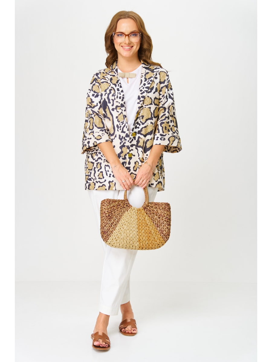Оформить заказ →Комплект женский состоит из жакета и брюк . Жакет однобортный с воротником пиджачного типа и цельнокроеным рукавом 3/4 для повседневной носки и торжественных случаев. Жакет свободный , прямого силуэта с центральной застежкой на 3 петли и пуговицы . Длина изделия чуть ниже линии бедра . Брюки женские заужены к низу из хлопка с боковыми карманами и застежкой на петлю и пуговицу .