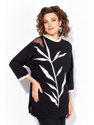 Нарядная блузка-туника больших размеров, выполнена из трикотажного джерси. Модель прямого силуэта, со спущенной линией плеча и рукавом длиной ¾-ти. Модель с округлым вырезом горловины на мягкой притачной планке контрастного цвета. По бокам предусмотрены разрезы на свободу. Полочка декорирована печатью накатом с мерцающим эффектом в виде ветви. На плече ассиметричная вставка из сетки.