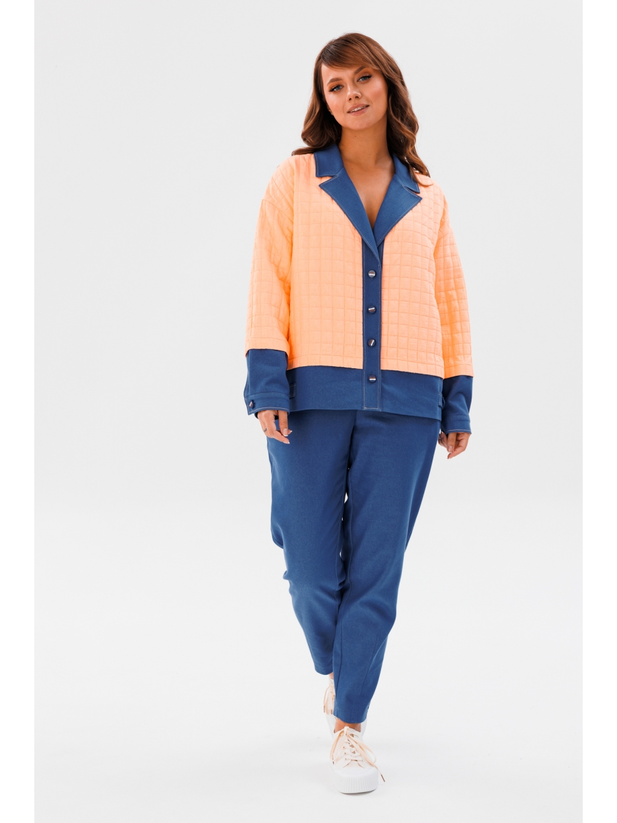 Жакет прямого силуэта со спущенной линией плеча, выполненный из двух видов ткани: стежка (не тянется) и джинсовой ткани (тянется). По переду отрезные планки, центральная застежка на петли-пуговицы. Низ оформлен отрезными планками с отделочными патами на петли и пуговицы. Горловина оформлена воротником пиджачного типа с лацканом. Рукава одношовные, с подрезом в нижней части, по низу с притачной ланжетой, застегивающейся на пуговицы. Жакет без подкладки.