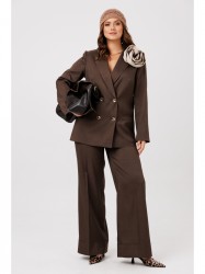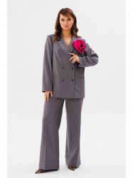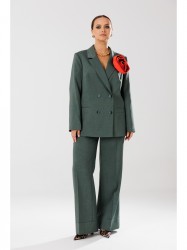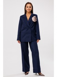 Жакет прямого кроя на подкладке. По переду нагрудные вытачки, функциональные карманы с листочкой, центральная двубортная застежка на петли-пуговицы. Горловина оформлена воротником пиджачного типа с лацканом. Спинка со средним швом, шлицей-планкой из отделочной ткани, застегивающейся на петли-пуговицы. Рукава втачные, двухшовные. Жакет декорирован съемным цветком из отделочной ткани.