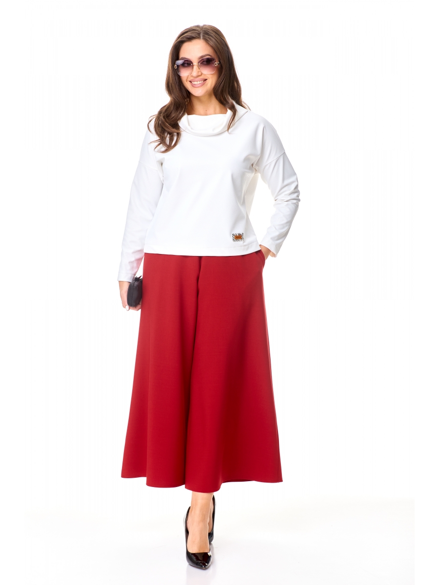 Интересный, удобный ,стильный женский комплект, состоит из юбки - брюк и трикотажного джемпера, из ткани имитирующей тонкую кожу на флисе. Джемпер прямого силуэта, со спущенной проймой и зауженным рукавом внизу. Воротник шалька Внизу блузона интересная аппликация. Юбка - брюки с функциональными карманами и с расширением книзу.