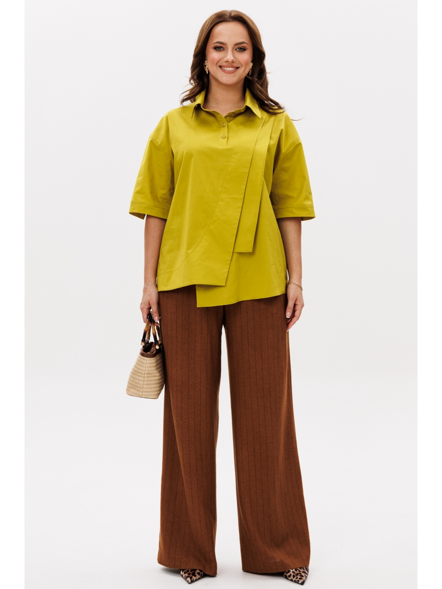 Блуза прямого свободного силуэта со спущенной линией плеча, выполненная из рубашечной ткани на хлопковой основе (тянется). По переду отрезная планка с застежкой на петли-пуговицы, ассиметричный наклонный подрез с отлетной деталью. Низ переда разноуровневый по длине. Спинка с отрезной кокеткой. Рукава одношовные с притачными манжетами. Горловина оформлена рубашечным воротником со стойкой.