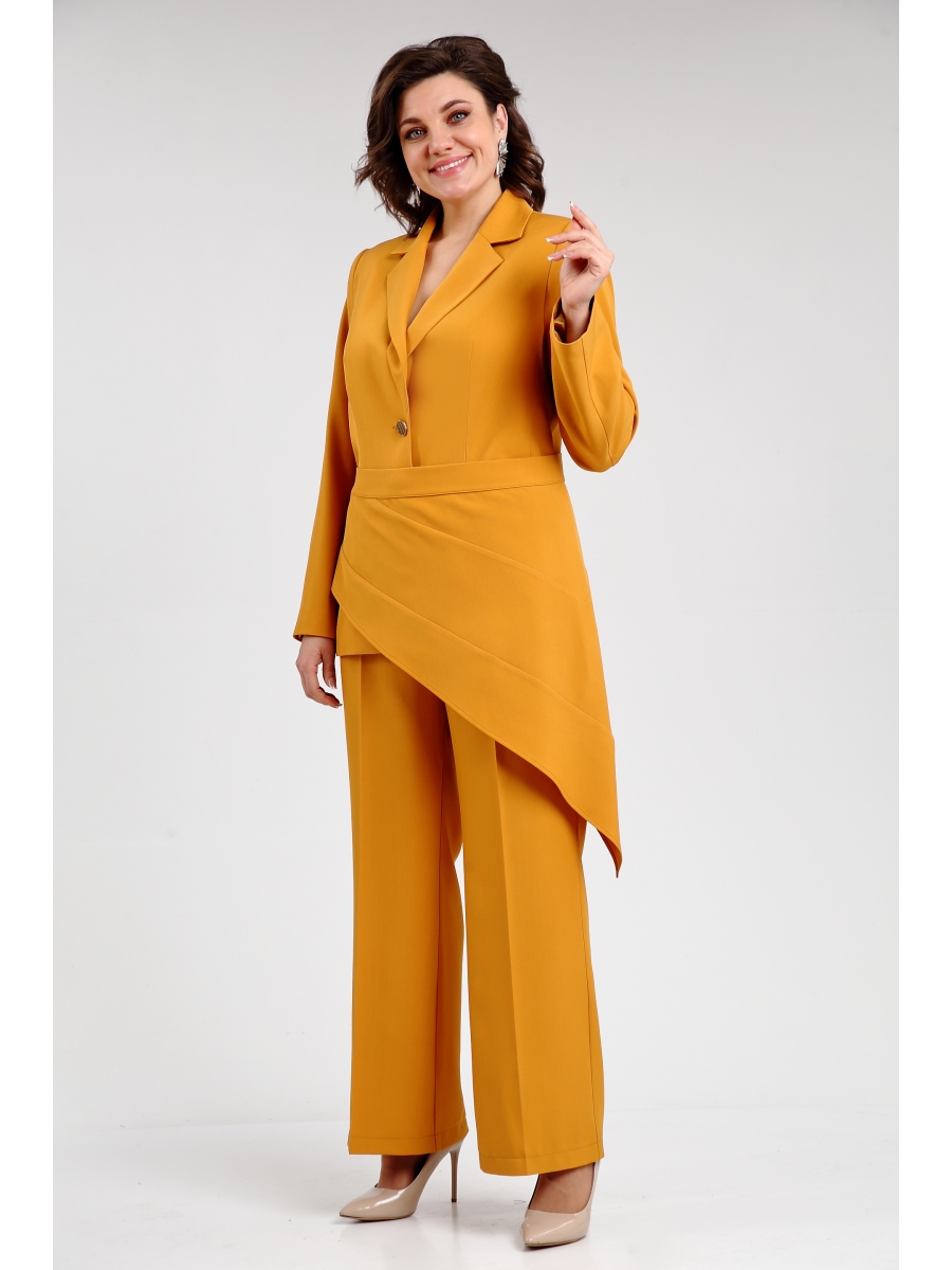 Оформить заказ →Костюм женский двухпредметный, состоящий из жакета и брюк. Жакет полуприлегающего силуэта с центральной бортовой застежкой на 2 петли-пуговицы до линии перегиба лацкана, с прорезными карманами в рамку. Спинка со средним швом. Рукав втачной двухшовный. Воротник пиджачного типа. Брюки классического силуэта с заутюженными кантами и приточным поясом на резинке по задним половинкам брюк. И застежкой на тесьму молнию и на 1петлю - пуговицу по поясу. И дополнение этого костюма является набедренная косынка, что делает этот костюм очень элегантным. Длина жакета по спинке 71см. Длина рукава 65см. Длина брюк 105см.