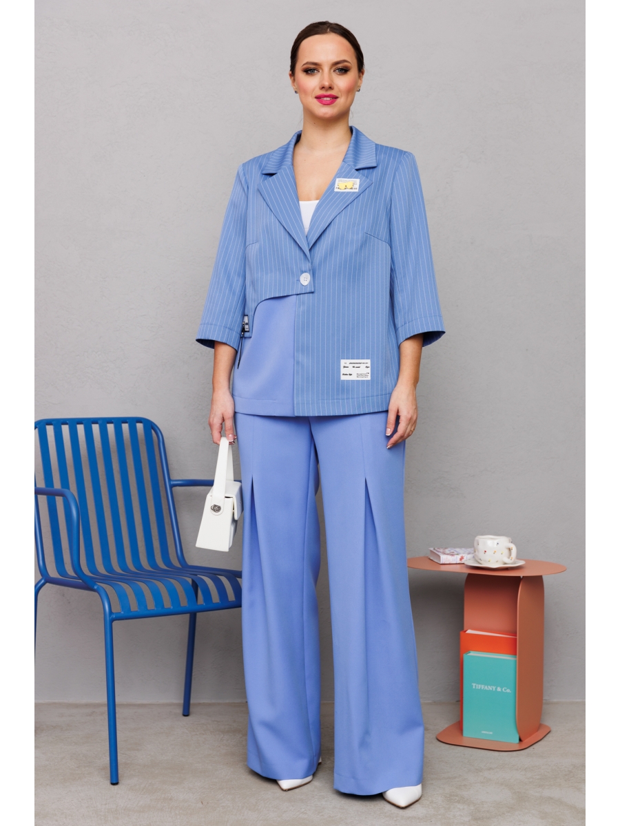 Жакет прямого кроя без подкладки, выполнен из двух видов костюмной ткани (тянется). По переду нагрудные вытачки, ассиметричный подрез. Застежка центральная, комбинированная: в верхней части - прорезная петля и отделочная пуговица, в нижней части – навесные петли и потайные пуговицы. Горловина оформлена воротником пиджачного типа с лацканом. Спинка со средним швом. Рукава втачные, двухшовные. Перед дополняет пришивной декор.
