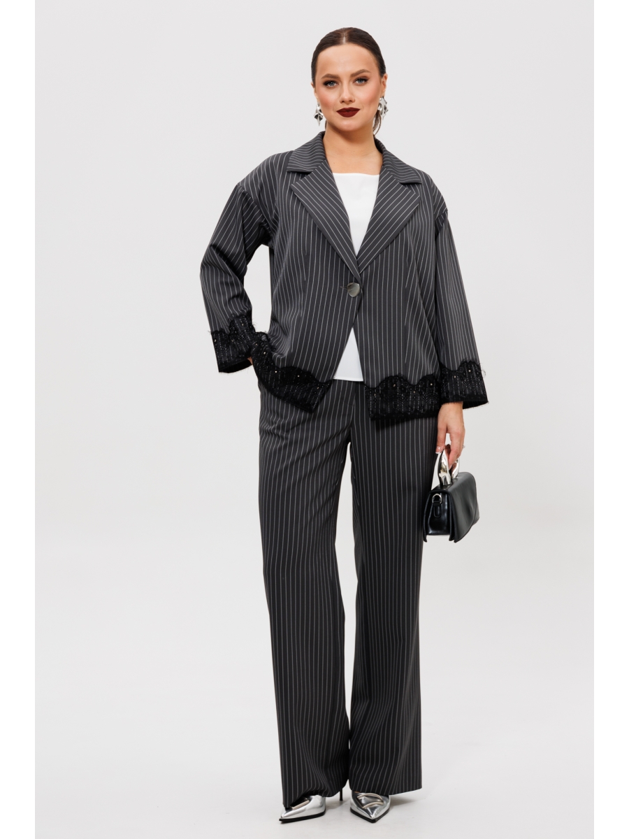 Жакет прямого силуэта со спущенной линией плеча, выполнен из костюмной ткани в тонкую полоску (чуть тянется). По переду нагрудная вытачка, центральная застежка на одну петлю и пуговицу. Горловина оформлена воротником пиджачного типа с лацканом. Спинка со средним швом. Рукава одношовные, длиной 7/8. Жакет без подкладки. Жакет декорирован по низу и по низу рукавов французским кружевом со стразами.