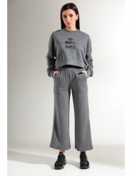 Укороченный свитшот с приспущенным плечом свободного прилегания, по переду украшен принтом "#girlboss". Манжеты и низ выполнены из основной ткани. Можно комбинировать с удлиненной майкой.