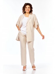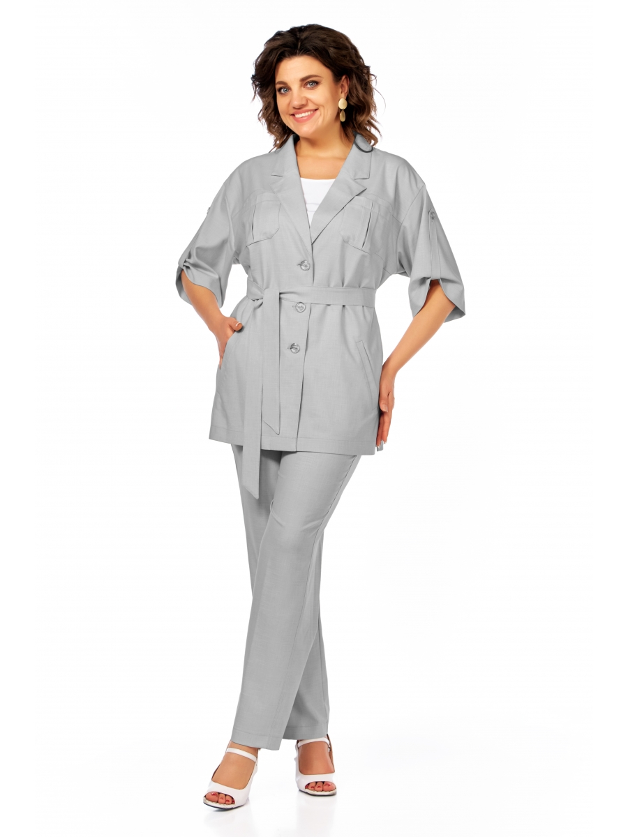 Жакет свободного силуэта имеет спущенную линию плеча и съёмный мягкий пояс, что придаёт ему непринуждённый и расслабленный вид. Застёжка центральная бортовая на три петли и пуговицы. На переде обработаны кокетки, нагрудные вытачки, накладные карманы, прорезные карманы с листочками. Спинка с кокеткой и средним швом. В боковых швах обработаны разрезы. Рукав втачной, длиной ниже локтя, присобран патой. Горловина обработана английским воротником.