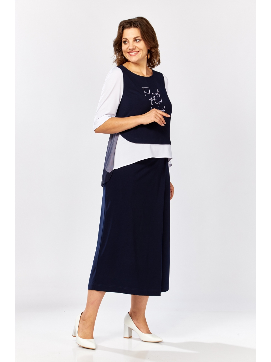 Блуза по переду состоит из двух частей, отрезная по талии. Верхняя часть из основной ткани с двумя нагрудными вытачками, декорирована печатью. Нижняя часть из отделочной ткани расширенная. Шов стачивания верхней и нижней части образует наплыв с отделочной строчкой. Спинка из двух частей, отрезная по талии, верхняя часть из основной ткани, нижняя из отделочной, с добавлением декоративной детали из сетки. Шов стачивания верхней части с нижней с наплывом и отделочной строчкой. Горловина круглая. Рукав одношовный, втачной, с вытачкой по головке, выполнен из отделочной ткани. Длина до локтя.