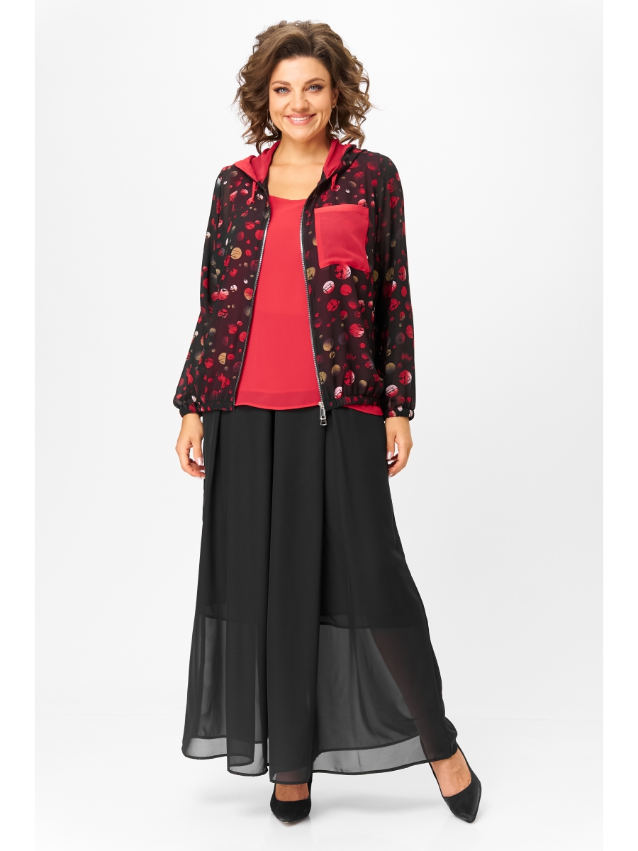 Комплект состоит из накидки на молнии, юбки-брюк (кюлоты) и топа из шифоновой ткани.
