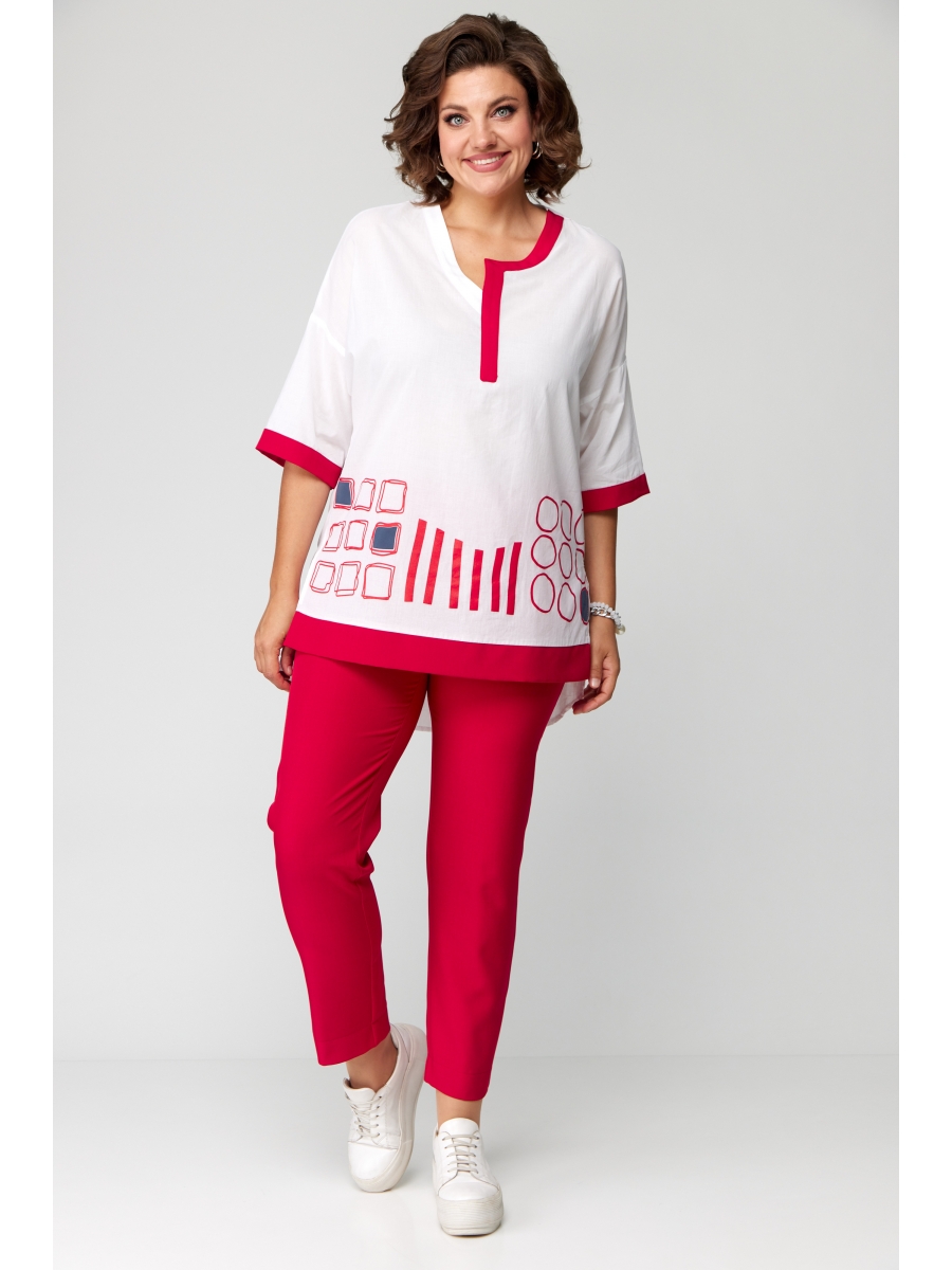 Блуза выполнена из легкой хлопковой дышащей ткани. Полочка прямая без нагрудных вытачек, горловина фигурная с отделочной контрастной деталью. По низу полочки печать и по краю отделка в цвет брюк. По спинке кокетка и в центре полочки неглубокая встречная складка, спинка длиннее переда. По бокам блузы разрезы. Рукав спущенный прямой, заканчивается пришивной манжетой из отделочной ткани в цвет брюк.