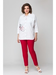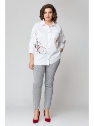 Блузка удлиненная, свободного кроя. Передняя часть блузы (полочка) свободного кроя без талиевых вытачек с накладным карманом. Застежка-планка с прорезными петлями на пуговицах. Спинка свободного кроя без талиевых вытачек. По центру спинки кокетка. Воротник рубашечного типа на стойке. Низ изделия с фигурными вырезами по боковому шву. Украшением изделия служит печать. Линия плеча спущенная, рукав притачной по низу рукава манжет с застежкой на пуговицу. Подойдет для женщин разной возрастной категории и разного телосложения. Можно носить как вместе, так и отдельно.