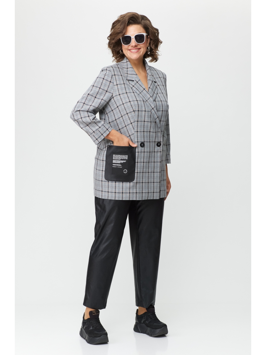 Жакет с двубортной застежкой на две петли пуговицы с воротником пиджачного типа на подкладке, на полочках обработаны боковые прорезные карманы в рамку и накладные. Рукав втачной 7/8 с притачной манжетой.