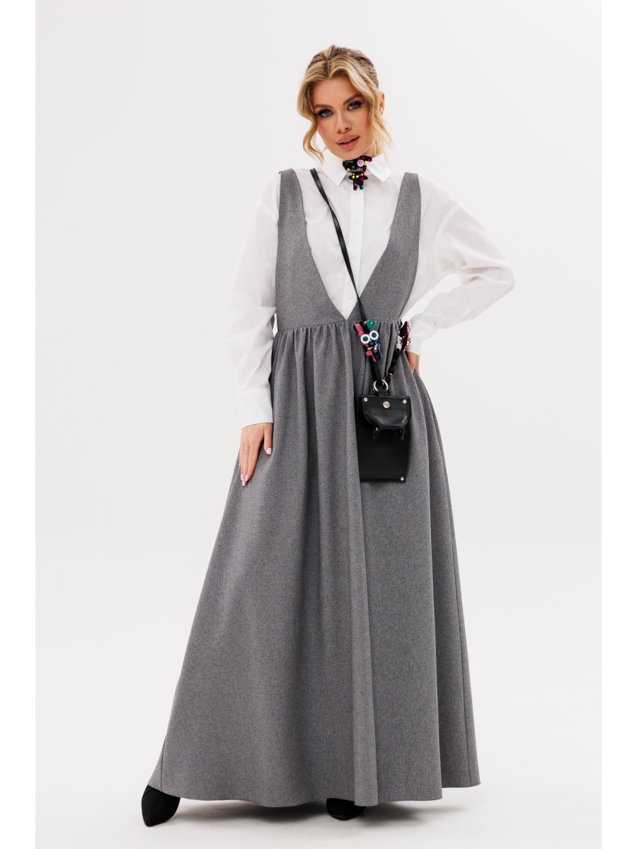 Сарафан А-силуэта, с фигурными бретелями. Застежка на боковую молнию.