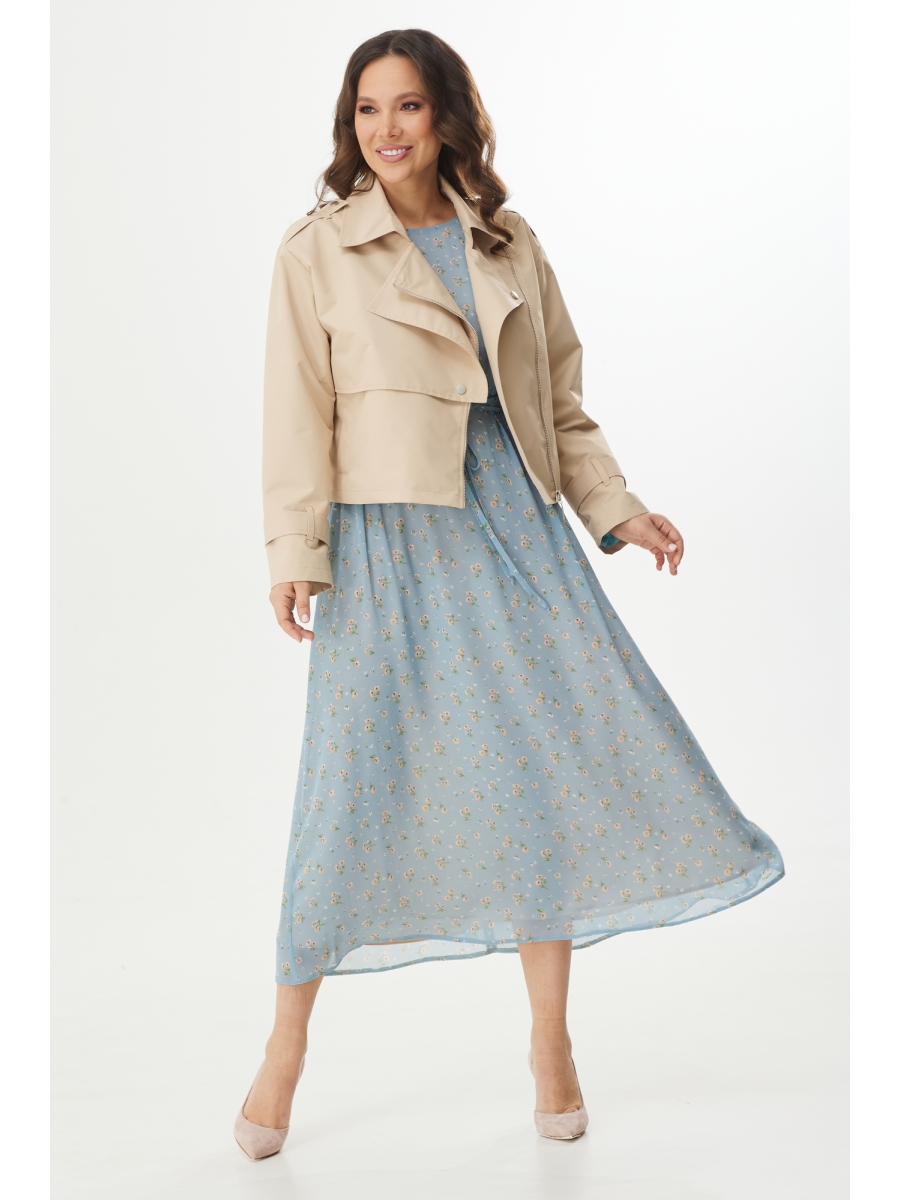 Куртка косуха прямого кроя, на подкладке. Выполнена из плотной плащевой ткани. Рукав втачной, слегка спущен. Горловина обработана отложным воротником. Застежка на металлическую молнию. Куртка дополнена удобными карманами. Отлично будет сочетаться с другими вещами в вашем гардеробе. Платье полуприлегающего силуэта, на комфортной подкладке. Выполнено из нежного струящегося шифона. Рукав короткий цельнокроеный. По спинке застежка "капелька" на пришивную пуговицу.