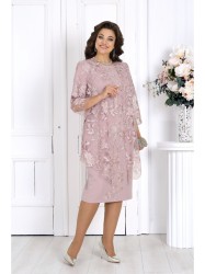 Платье женское, полуприлегающего силуэта, выполнено из костюмно-плательной ткани. Модель на подкладке, с плечевыми накладками. Перед с рельефными швами, направленными от горловины; центральная часть декорирована цветочной аппликацией, настроченной от горловины до низа. На спинке обработаны рельефные швы, направленные от горловины; в верхней части среднего шва спинки предусмотрена застежка на потайную тесьму-«молнию» (50 см), в нижней части – шлица. Вырез горловины округлый, углубленный по переду. Рукав короткий, втачной. Длина платья – 104 см, длина рукава – 25 см.