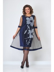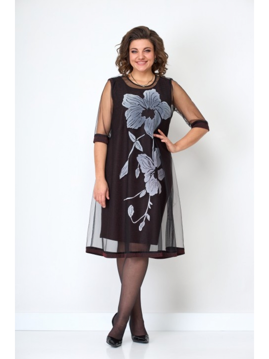 Комплект женский из костюмно-плательной ткани. Комплект состоит из двух платьев. Нижнее платье прилегающего силуэта. Перед и спинка платья из отнотонной ткани с люрексовой нитью. Верхнее платье свободного силуэта, клешенное от груди из очень красивой сетки с цветочным принтом. Перед нижнего платья цельный с нагрудными вытачками, горловина с овальным вырезом. Спинка нижнего платья цельная с талевыми выточками. Рукава верхнего платья втачные, одношовные, 3/4 из ткани сетки однотонной и с манжетами из отделочной ткани, нижнее платье без рукавов. Низ верхнего платья обработан планкой из отделочной ткани шириной 5см.