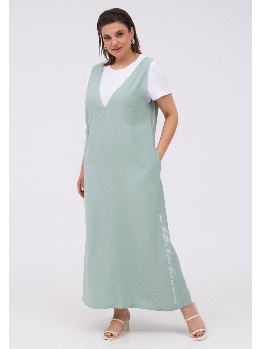 Сарафан длины макси с углубленной линией декольте v-образной формы. По талии справа декоративная кулиса со шнуром и фиксатором. Вдоль бокового шва слева контрастный принт.