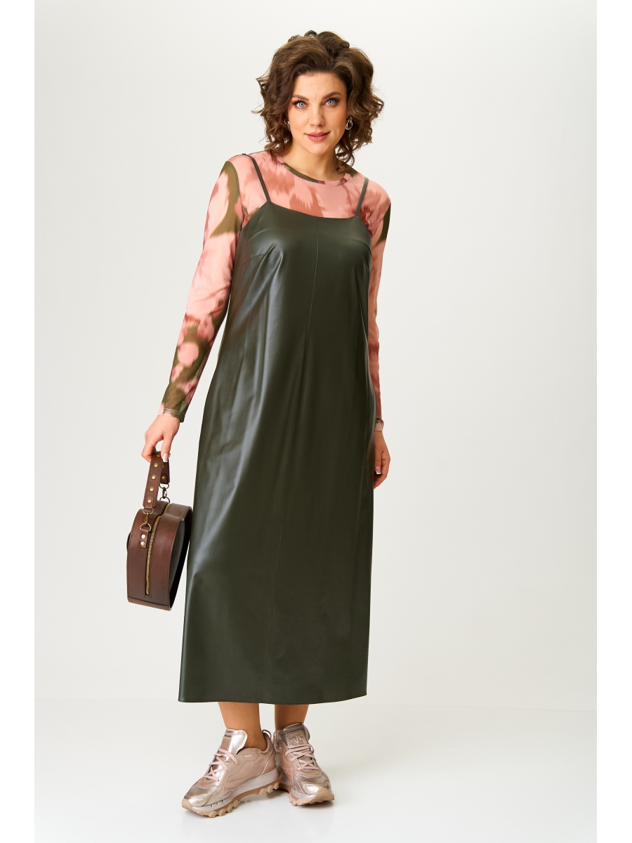 Сарафан выполнен из трикотажного полотна среней плотности с отделкой под "кожу". Сарафан свободного силуэта, бретели регулируются. Нагрудные выточки, карманы в боковых швах, разрезы внизу по боковым. По переду и по спинке отсрочен вертикальный центральный шов.