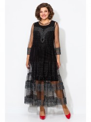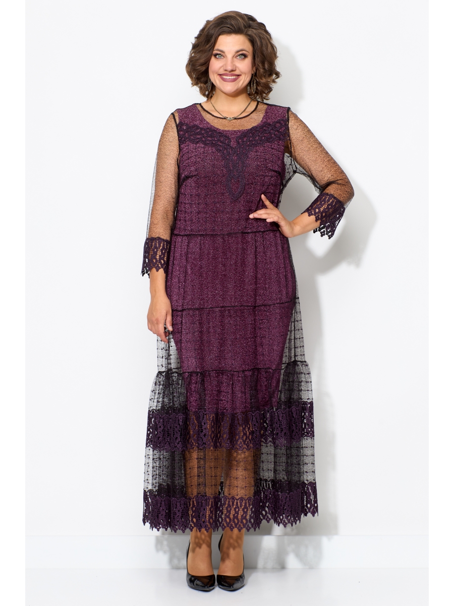 Нижнее платье полуприлегающего силуэта. Вырез полукруглый ,по полочке нагрудные вытачки, спинка прямая. Верхнее платье из очень красивого гипюра с тонкой серебристой нитью. Платье отрезное по линии талии, нижняя часть изделия состоит из трех воланов, верхняя часть свободного кроя, горловина полукруглая, рукав 3/4. Этот комплект можно носить как вместе так и раздельно.