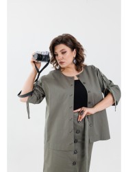Жакет прямого свободного силуэта с заниженной линией плеча. Рукава с отворотами и регулируемыми отделочными деталями. Вырез горловины округлый, застёжка на пуговицы по всей длине. Спинка с кокеткой и декоративной патой.