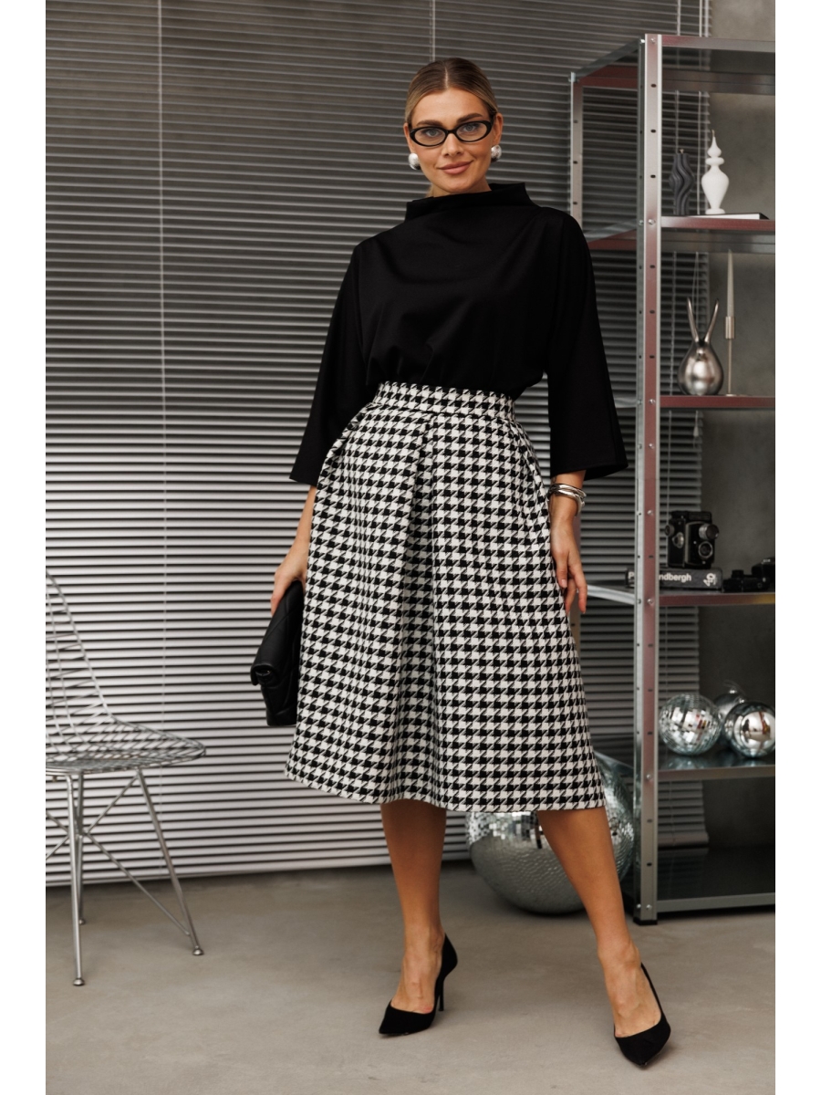Юбка из фактурной ткани в рубчик с принтом гусиная лапка - теплая, плотная и качественная, практически не мнется. В верхней части идут складки: по центру-встречная, по бокам - односторонние. Пояс отрезной, по бокам карманы. Застежка по спинке на потайную молнию и пуговицу. Юбка на подкладке.