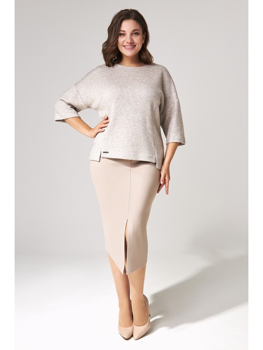 Трикотажная юбка на подкладке с разрезом по переду, застегивается на молнию и пуговицу сбоку.