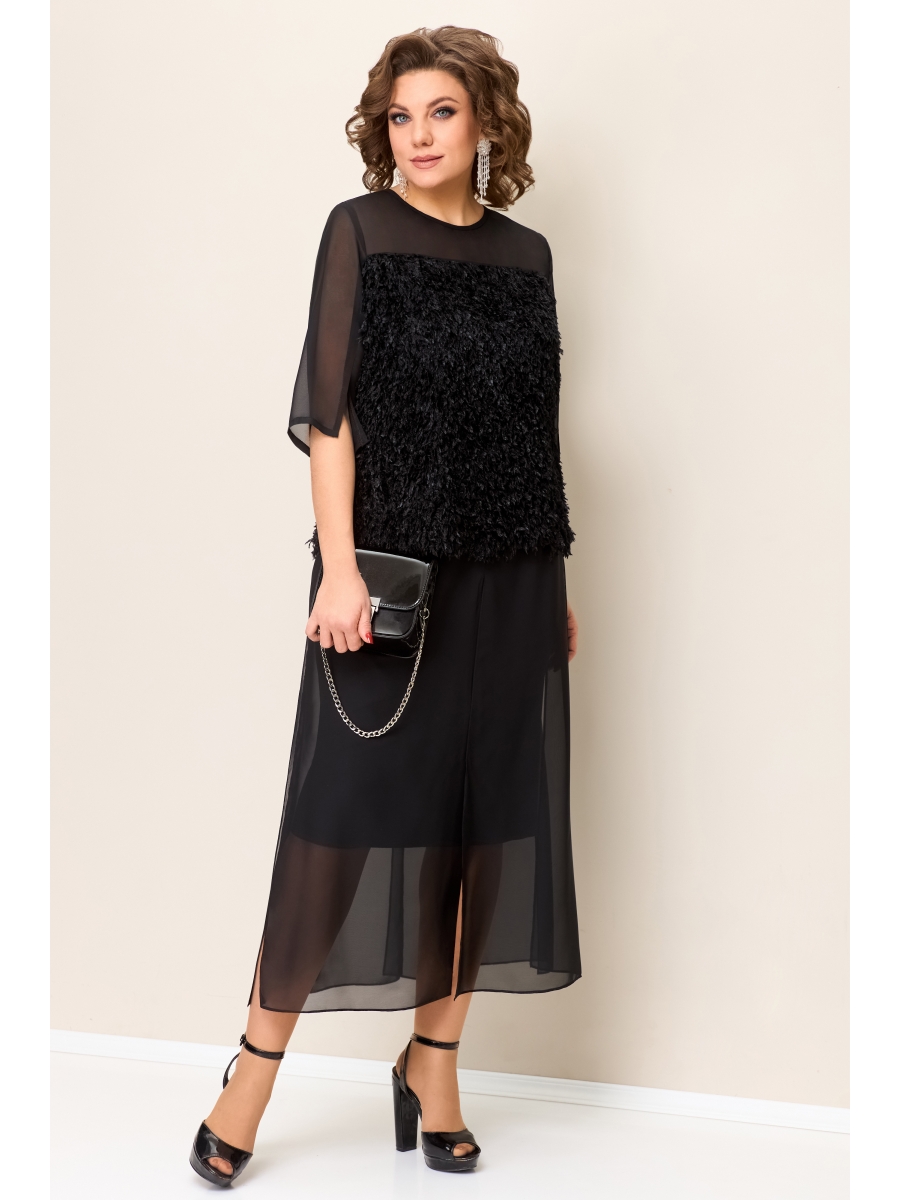 Двойная летящая юбка с верхним слоем из шифона, с глубокими разрезами. Нижняя часть юбки - прямая, со шлицей. По спинке юбки - застежка на молнию и пуговицу.