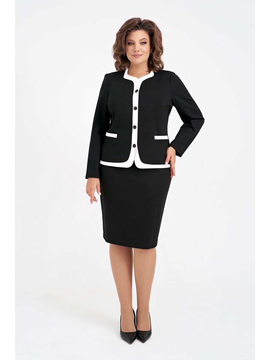Жакет полуприлегающего силуэта из трикотажа средней плотности, частично на подкладке с плечевыми накладками и втачными рукавами, по переду функциональные накладные карманы, застежка на петли и пуговицы. Декор по планке, горловине и листочке кармана из ткани белого цвета.