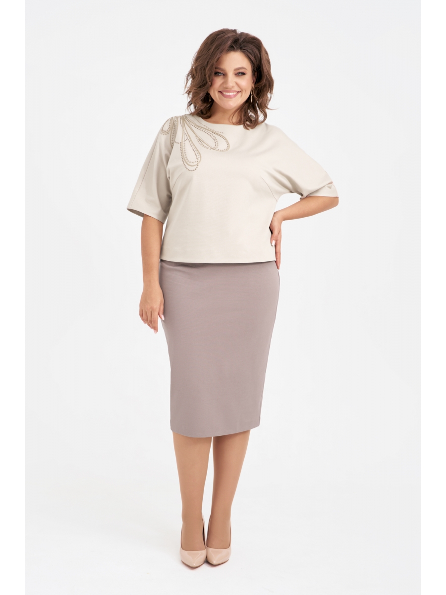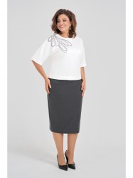 Женский костюм, состоящий из джемпера и юбки, выполнен из мягкого трикотажа, который держит форму.