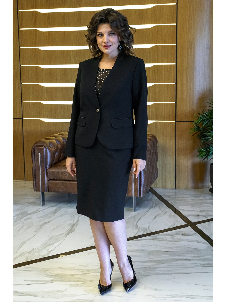Жакет полуприлегающего силуэта с центральной застежкой на одну пробивную петлю и пуговицу. Перед с рельефными швами, с горизонтальными карманами с клапаном и двумя обтачками. Спинка со средним швом и рельефными швами, выходящими от линии проймы. Рукава втачные, двухшовные, низ декорирован пришивной пуговицей. Воротник – втачная стойка. Жакет на подкладке и с плечевыми накладками.