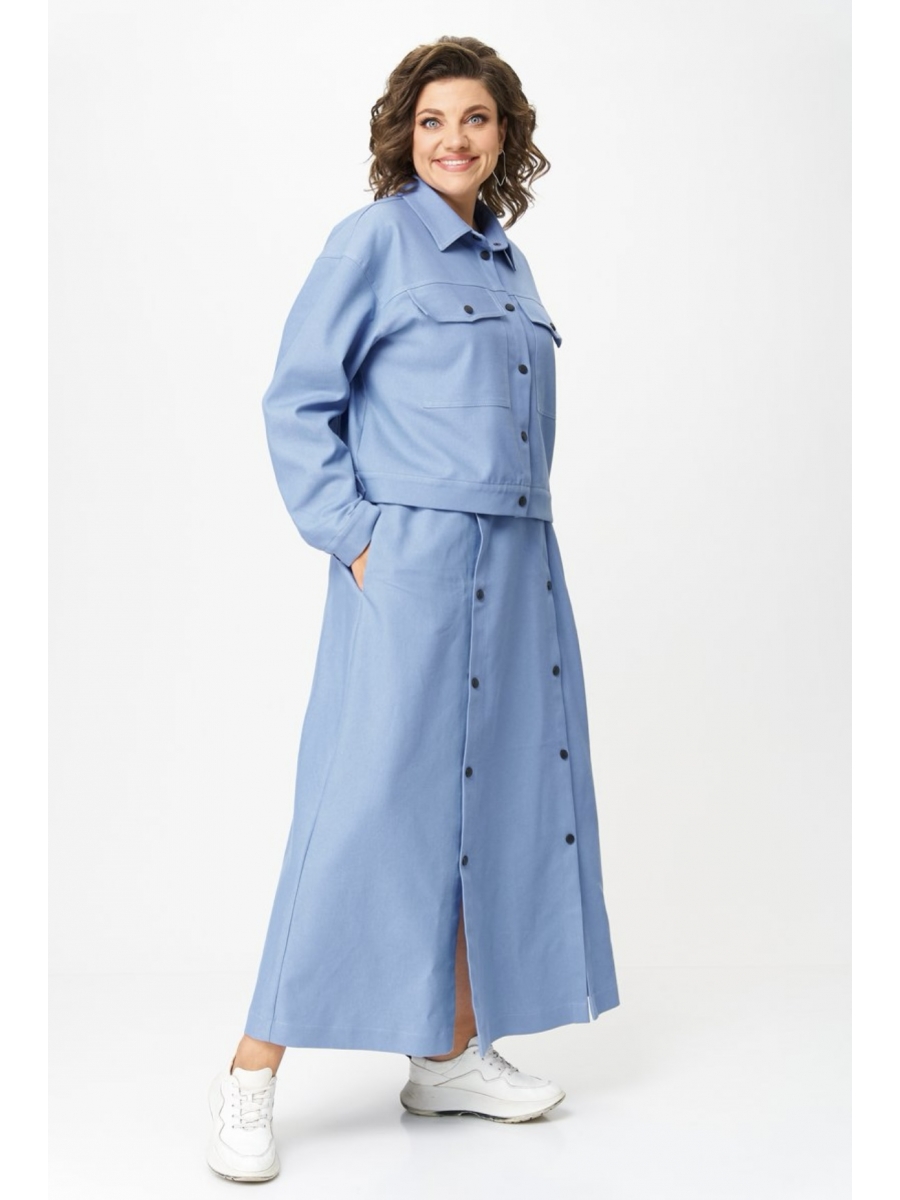 Элегантный женский костюм, состоящий из жакета и юбки, выполнен в приглушенном голубом цвете, добавляющем изысканность образу.