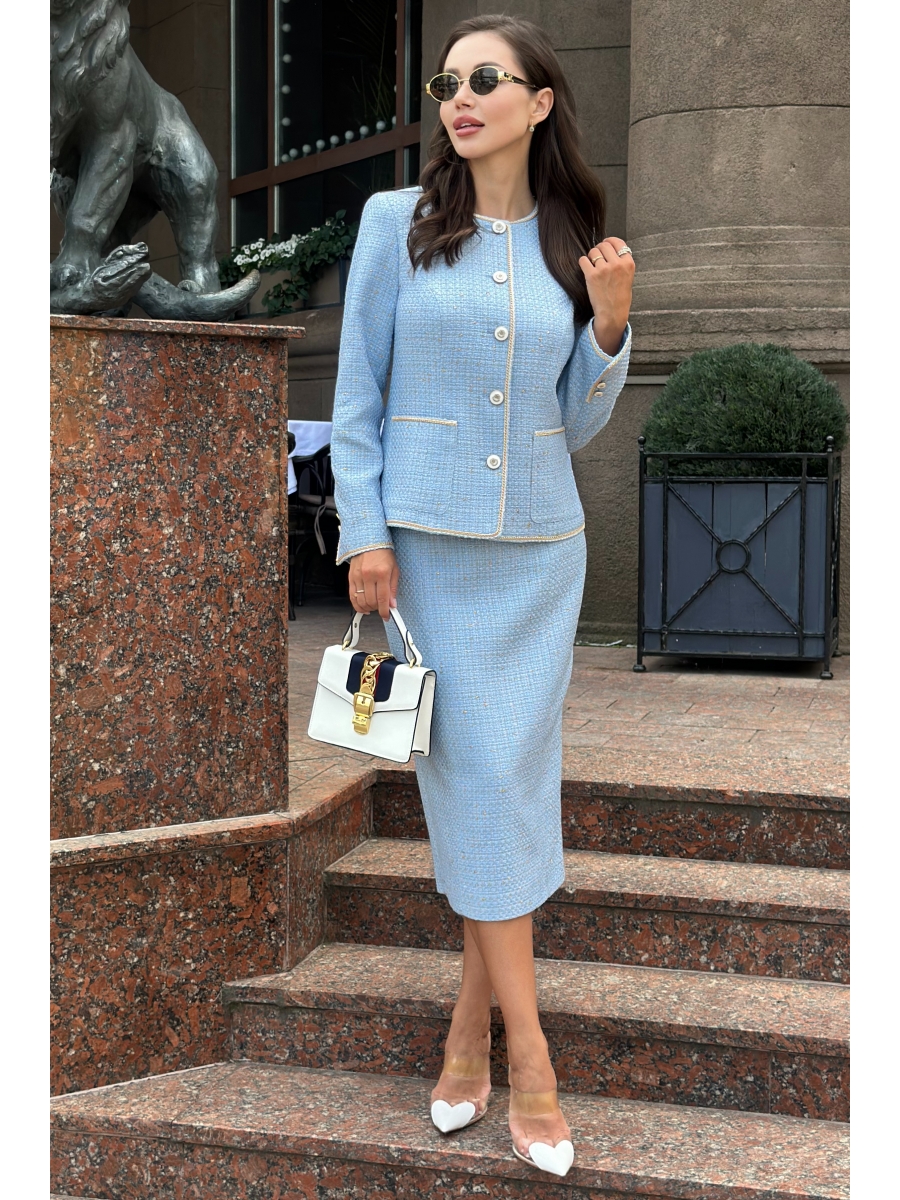 Роскошный твидовый костюм небесно-голубого оттенка – воплощение элегантности и изысканного вкуса. Жакет с округлым воротником, аккуратными пуговицами и золотистой тесьмой с цепочкой подчеркивает утонченность образа, а юбка средней длины добавляет женственности. Идеальный выбор для деловых встреч или светских мероприятий, костюм отлично сочетается с миниатюрными аксессуарами, подчеркивая стиль и индивидуальность. Материал высокого качества и продуманные детали создают гармоничный и благородный ансамбль.