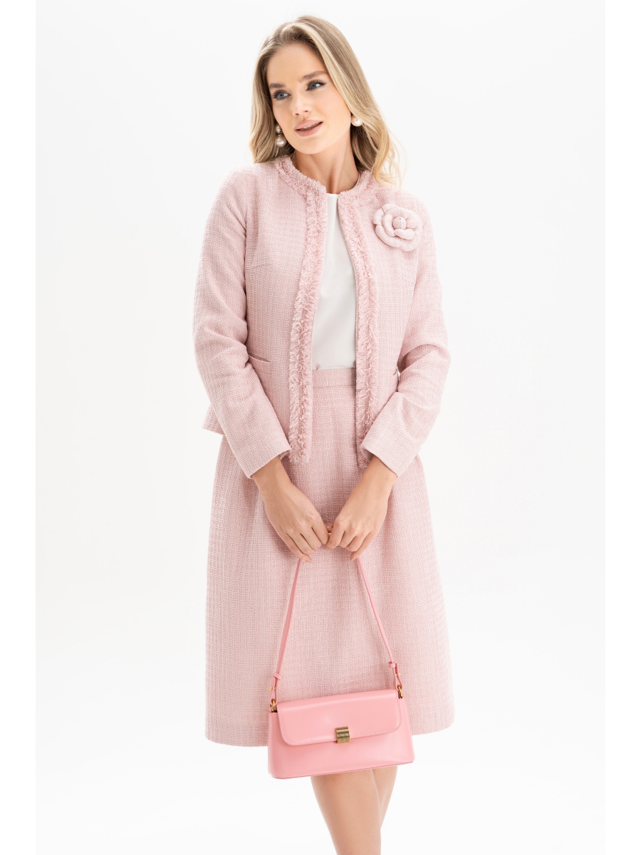 Стильный женский твидовый костюм с юбкой в нежно-пудровом цвете со съёмным цветком ручной работы. Этот элегантный и модный комплект станет вашим незаменимым помощником в создании неповторимых и запоминающихся образов.