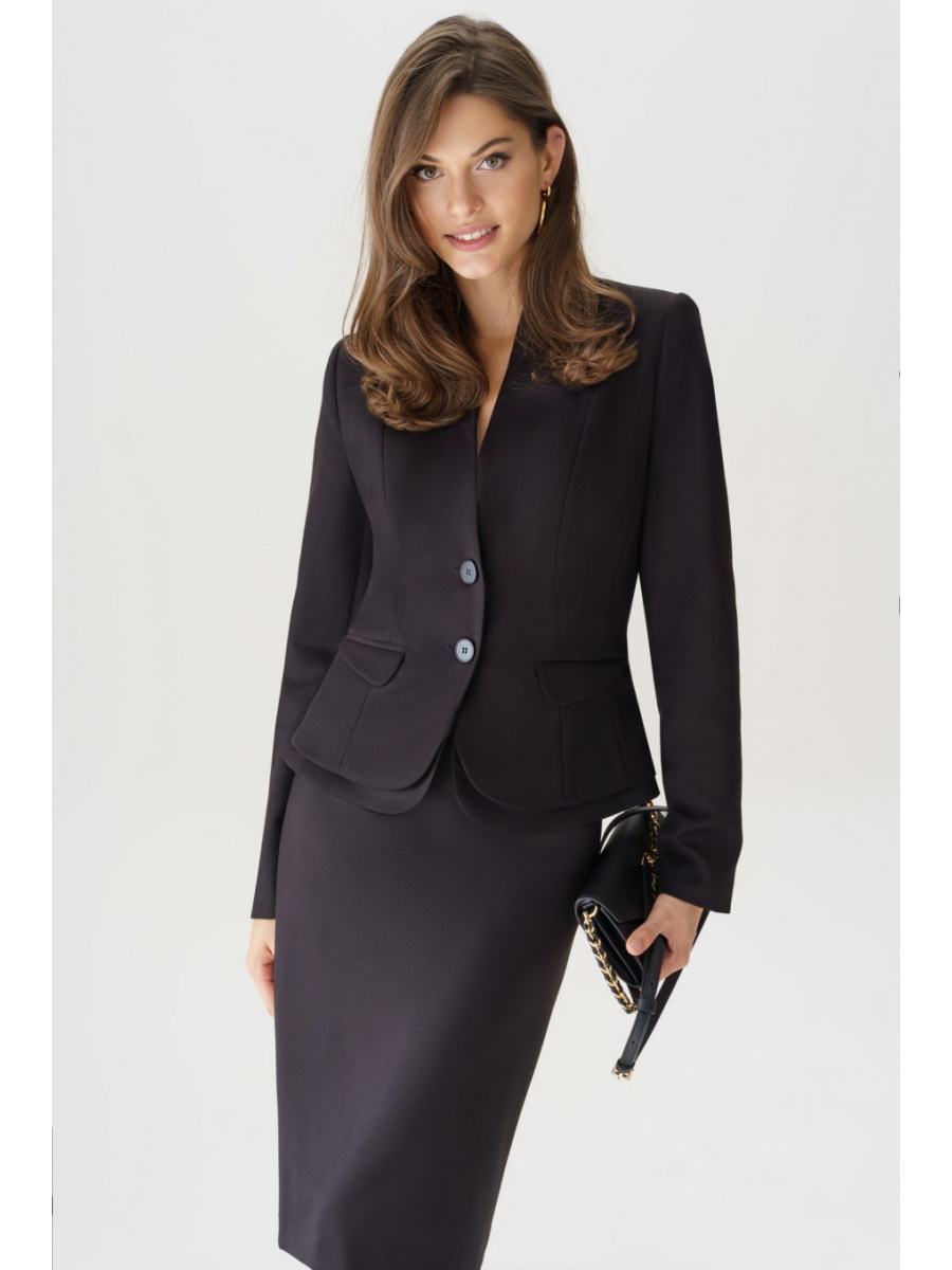 Костюм женский из костюмно-плательной ткани, состоит из жакета полуприлегающего силуэта и юбки.