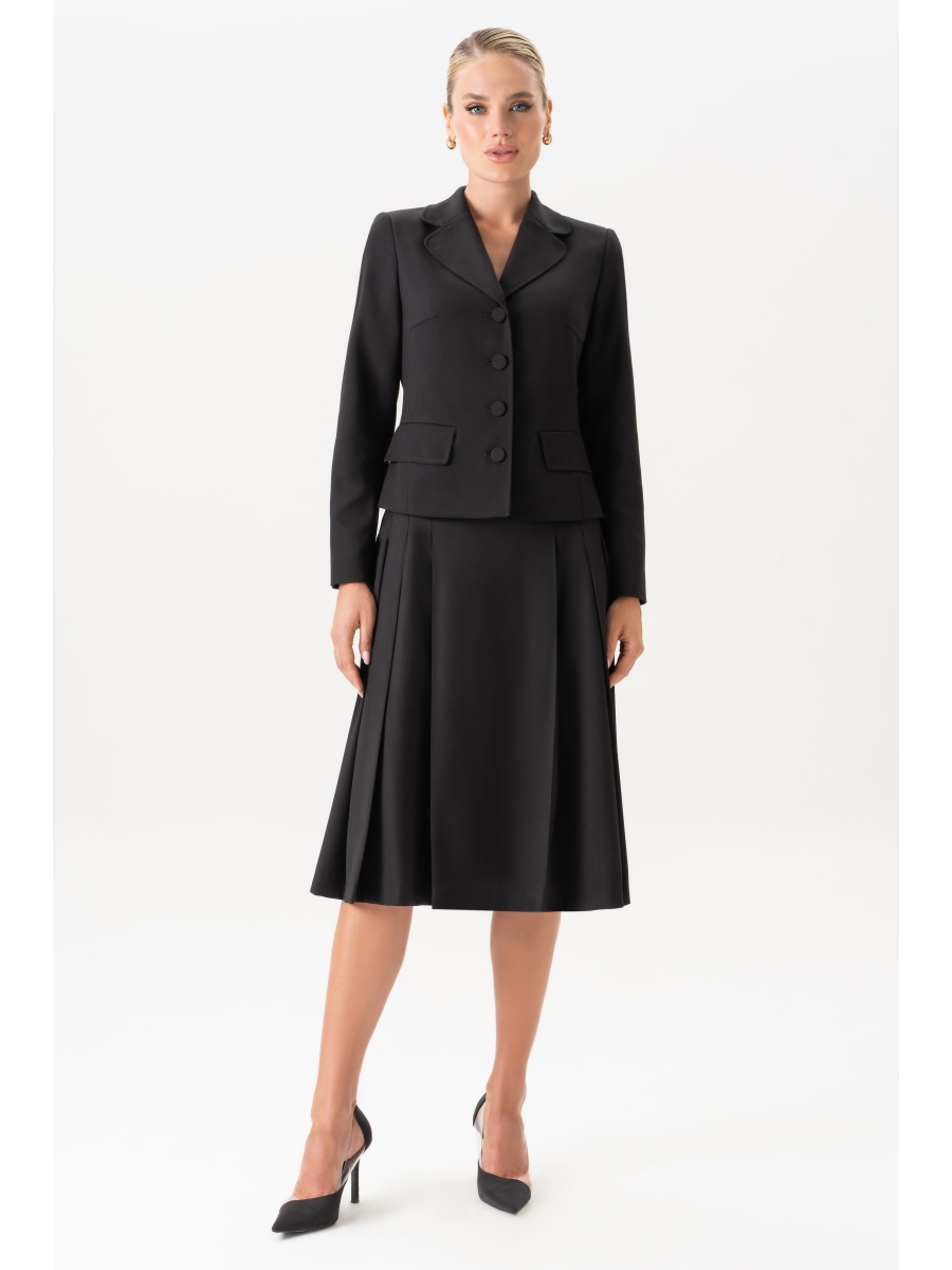 Классический костюм женский с юбкой от URS / ЮРС — безупречный выбор для тех, кто ценит элегантность, строгость и комфорт. Этот деловой костюм состоит из жакета и юбки миди, выполнен из качественной ткани с добавлением шерсти.