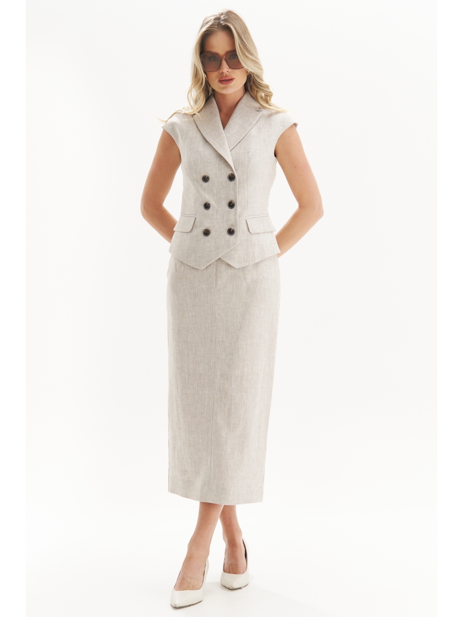 Комплект состоит из приталенного жилета с эффектной двубортной застежкой и прямой юбки миди-длины. Лёгкий оттенок натурального льна делает образ утонченным и универсальным, а современный крой подчеркивает фигуру, сохраняя свободу движений. Ткань из 100% льна обеспечивает комфорт даже в жаркую погоду, дарит коже ощущение прохлады и естественной свежести.