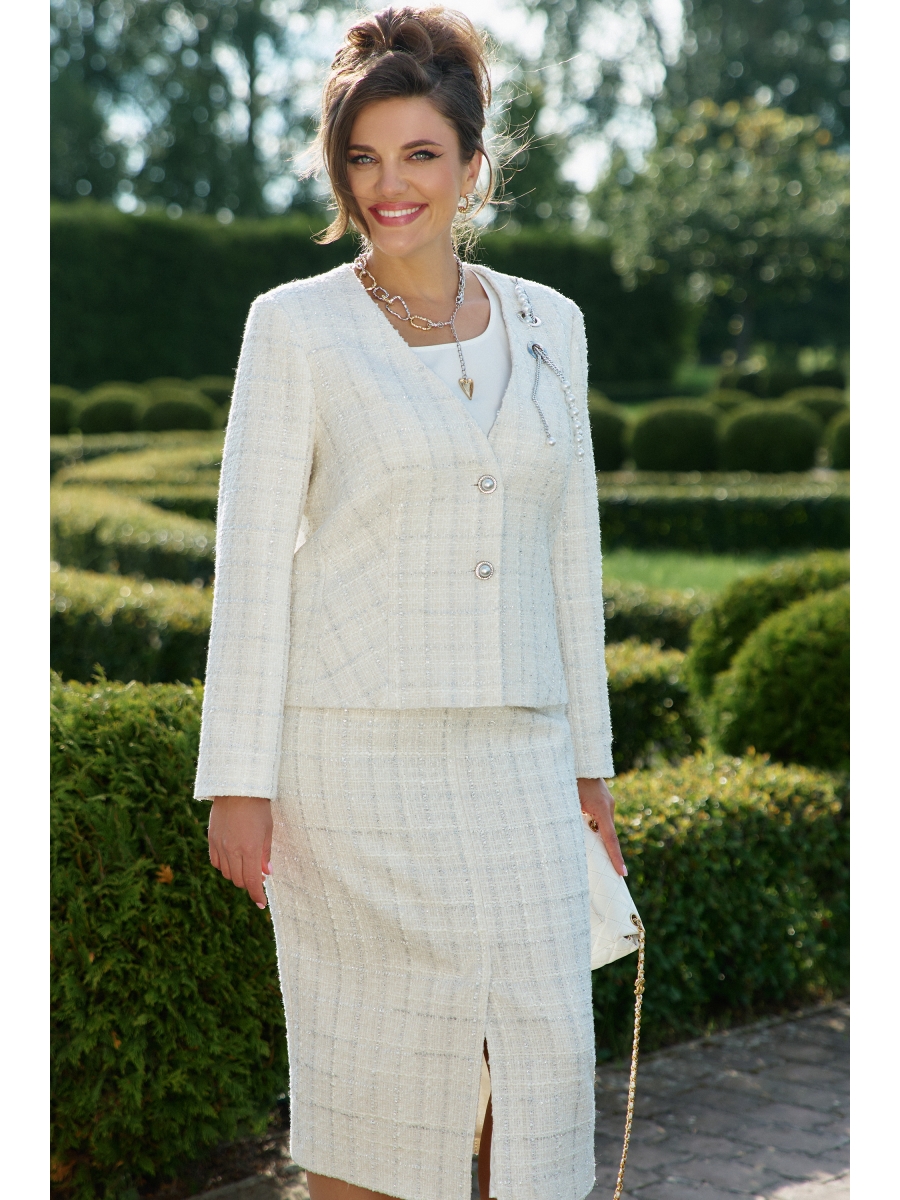 Костюм антично-белого оттенка и серебристой нити с трендовым декором на левом плече. В крупные металлические люверсы проходят цепи и жемчужная нить.
