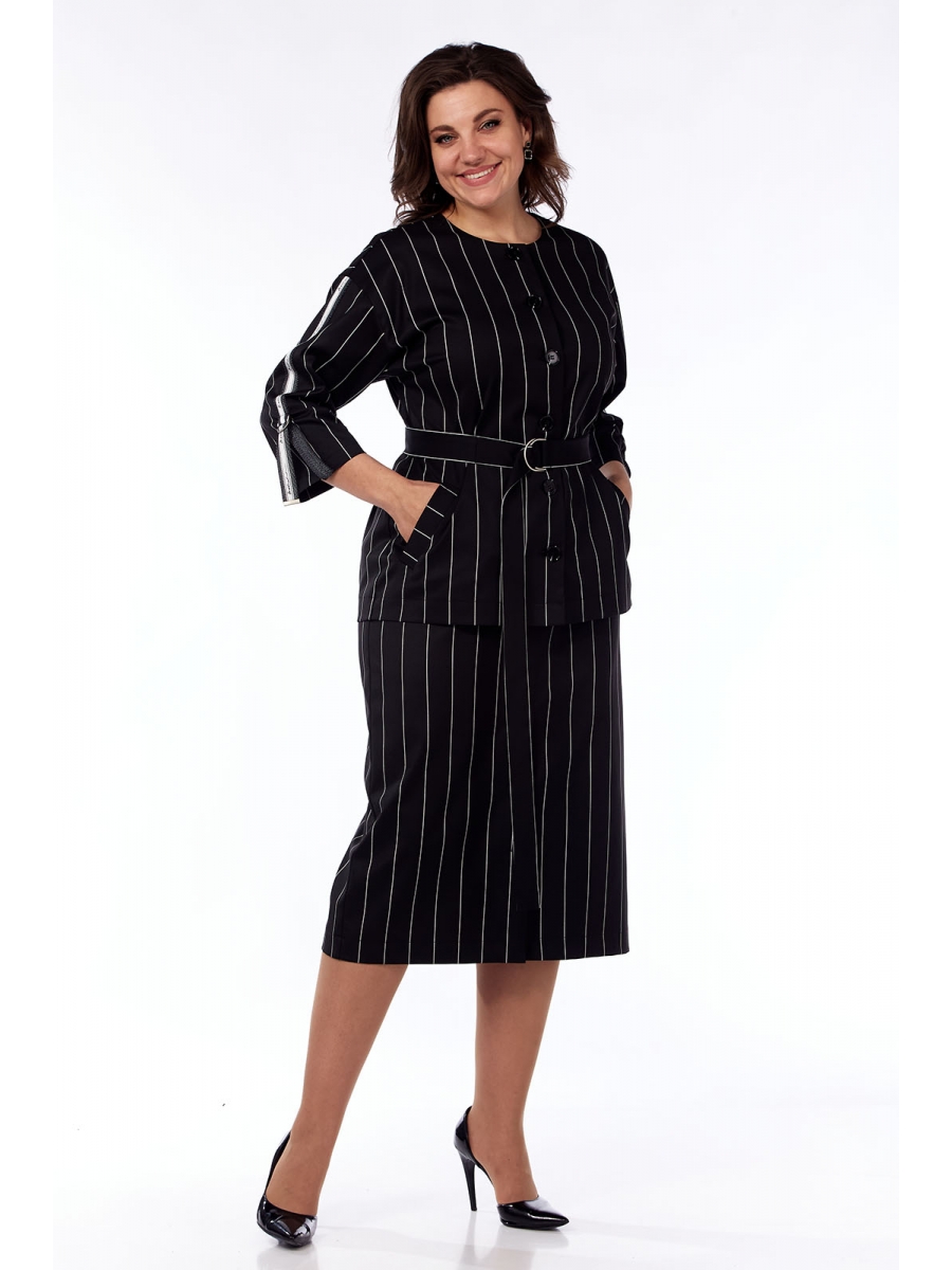 Жакет прямого силуэта, из костюмной ткани. С круглым вырезом горловины, центральной застежкой, застегивающейся на петли и пуговицы. Детали переда с карманами с листочкой. Со спущенной линией плеча, рубашечными рукавами, с настроченной отделочной тесьмой с полукольцами. Спинка цельная. Комплектуется съемным поясом с полукольцами.